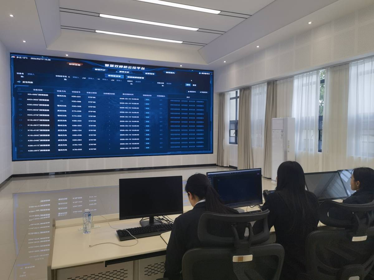 该中心里面有一块面积达24平方米的智慧大屏上,对面有几名工作人员在电脑前操作系统,屏幕上桥梁受力、变形、温度、湿度等数据实时跳动。