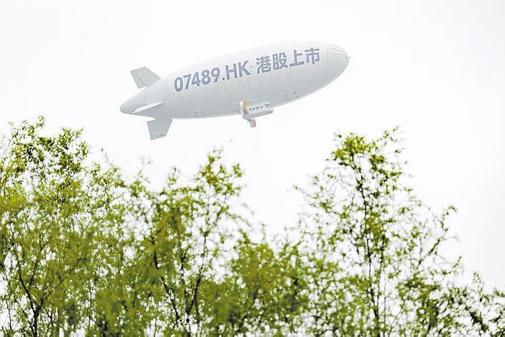 3月19日上午,“岚图汽车”敲钟上市,印有“岚图汽车”股票代码的飞艇飞过武汉上空。(湖北日报全媒记者 张灿 陈少哲 摄)