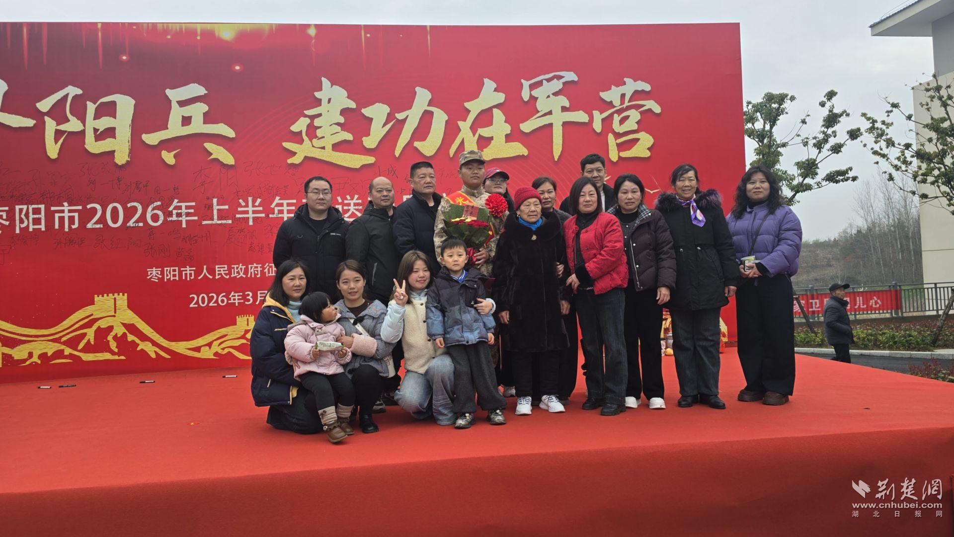 荆楚网(湖北日报网)讯(通讯员 常梦星)戎装加身赴军营,家乡深情送新兵。3月18日上午,在枣阳市2026年春季新兵欢送仪式上,枣阳市人武部、市退役军人事务局、市关爱退役军人协会开展“逐梦军营守家国,青春无悔踏征程”新兵入伍全家福拍摄活动,为即将奔赴军营的新兵及家属定格光荣瞬间、传递暖心关怀。