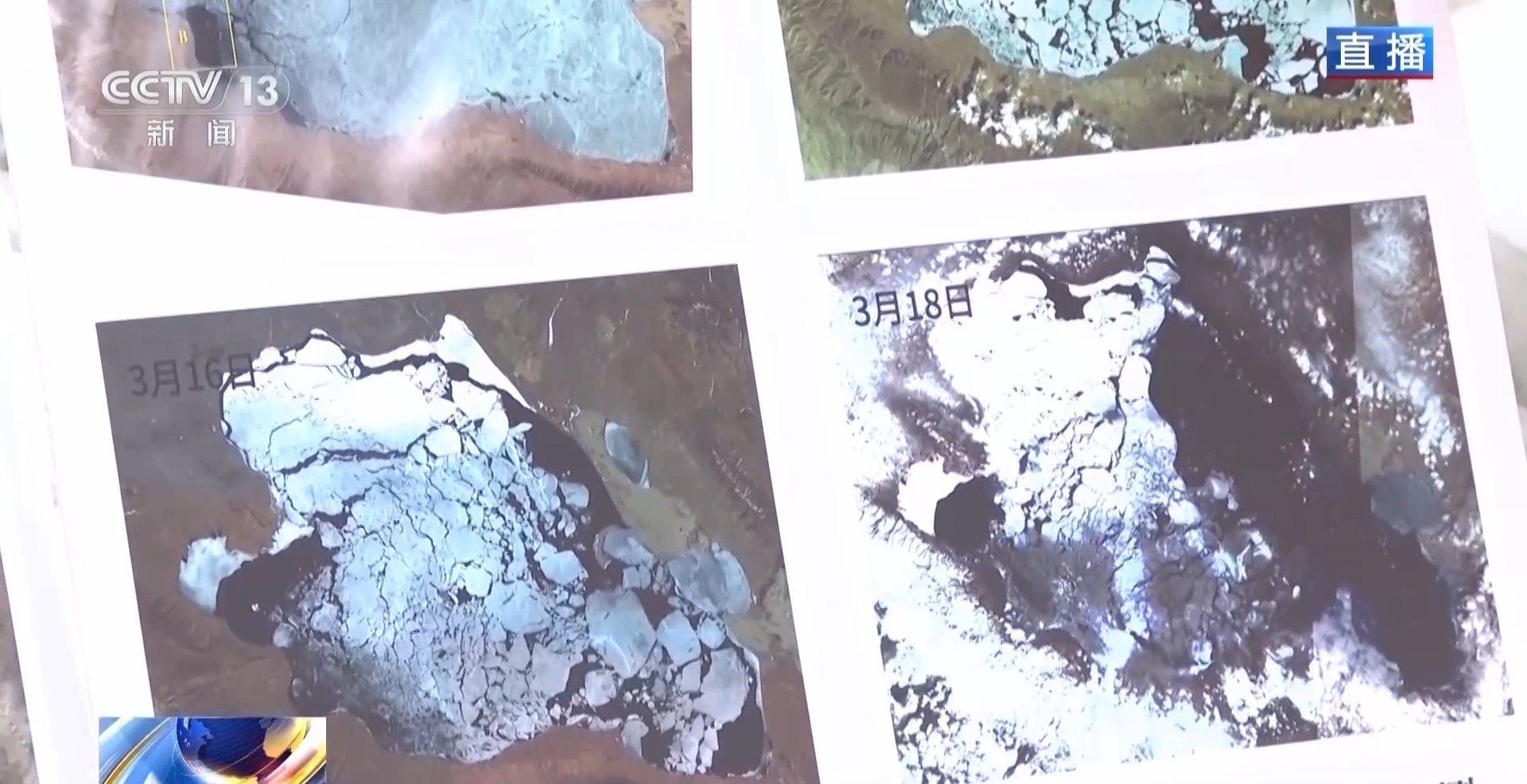 3月16日和18日,主湖体出现了大面积的冰块和冰裂纹。
