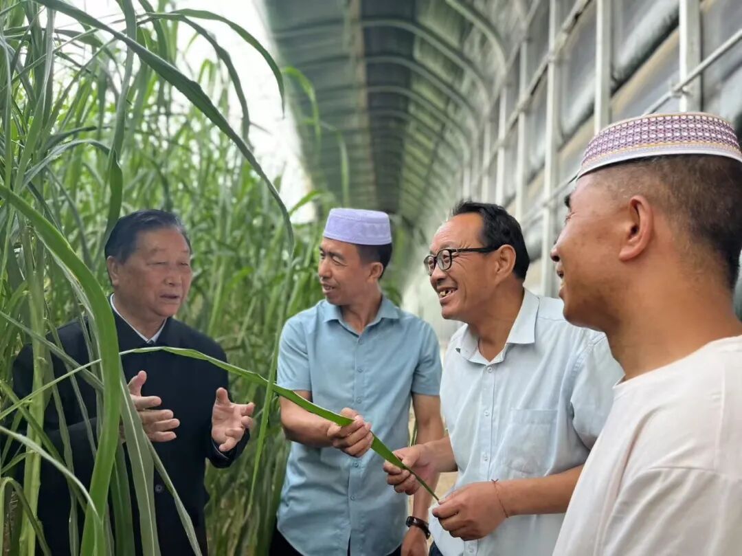 林占熺(左)在宁夏闽宁镇菌草育苗基地为村民讲解巨菌草知识