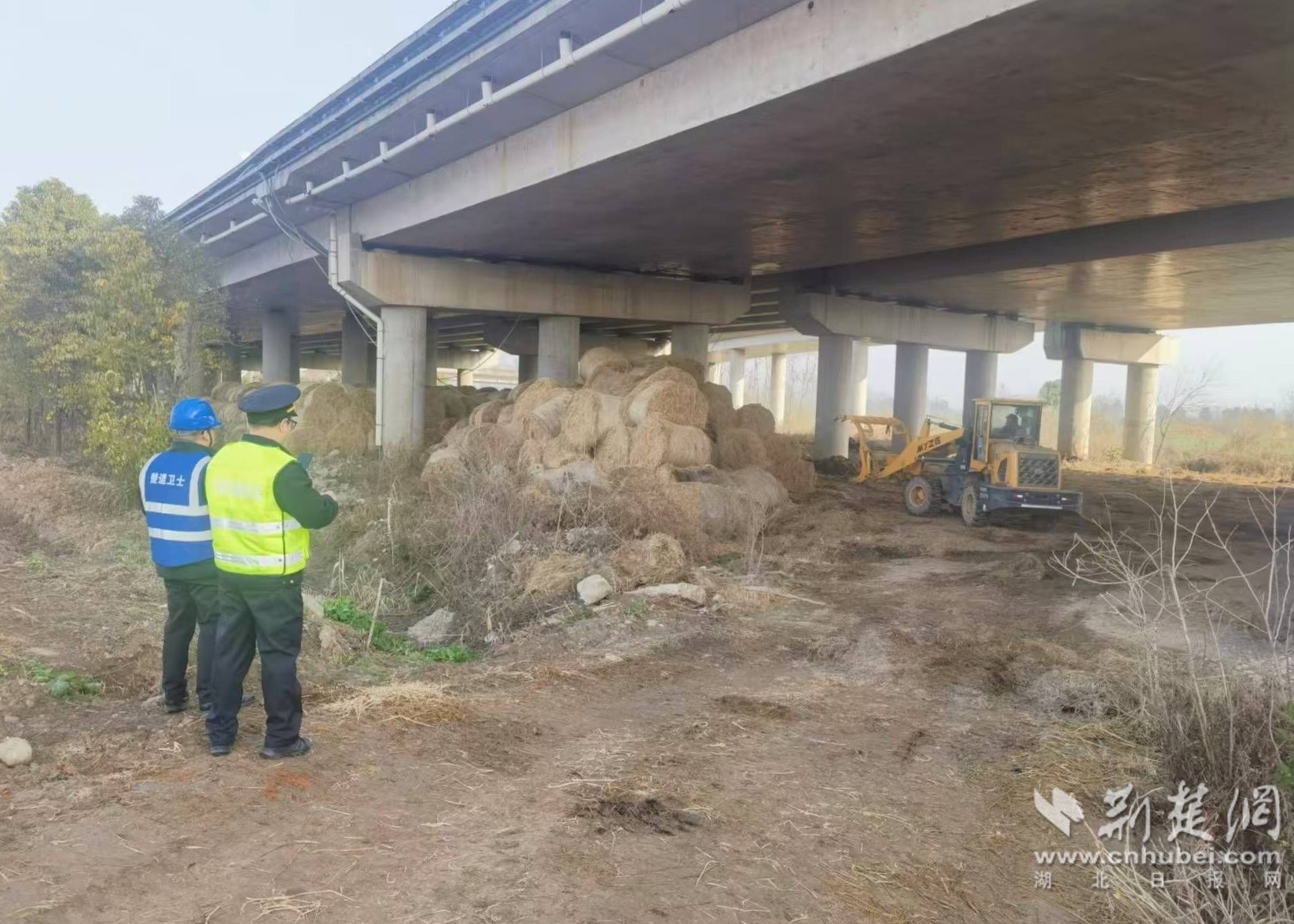 排查与整治同步推进,针对桥下违规堆放生活垃圾、建筑废料、草料及违法搭建等“顽疾”,大队强化多方协作,依法重拳整治。在孝洪高速燕窝匝道桥下,执法人员联合养护单位及当事人,调集机械设备清运违规堆放草料264立方米,彻底消除防火防灾安全风险,让昔日“杂乱堆”变为整洁安全区。