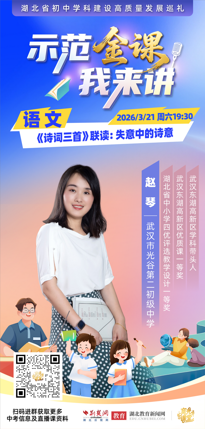 荆楚网(湖北日报网)讯(记者齐一璇、许文秀)面对李白、刘禹锡、苏轼在人生困顿中写下的经典诗词,中学生如何读懂“失意中的诗意”?3月21日(本周六)晚7:30点,“示范金课我来讲——湖北省初中学科建设高质量发展巡礼”活动将推出精彩一课,由武汉市光谷第二初级中学语文教师赵琴,带来一节融合古典诗词与现代科技的课程“失意中的诗意——群诗下的文学阅读与创意表达”。