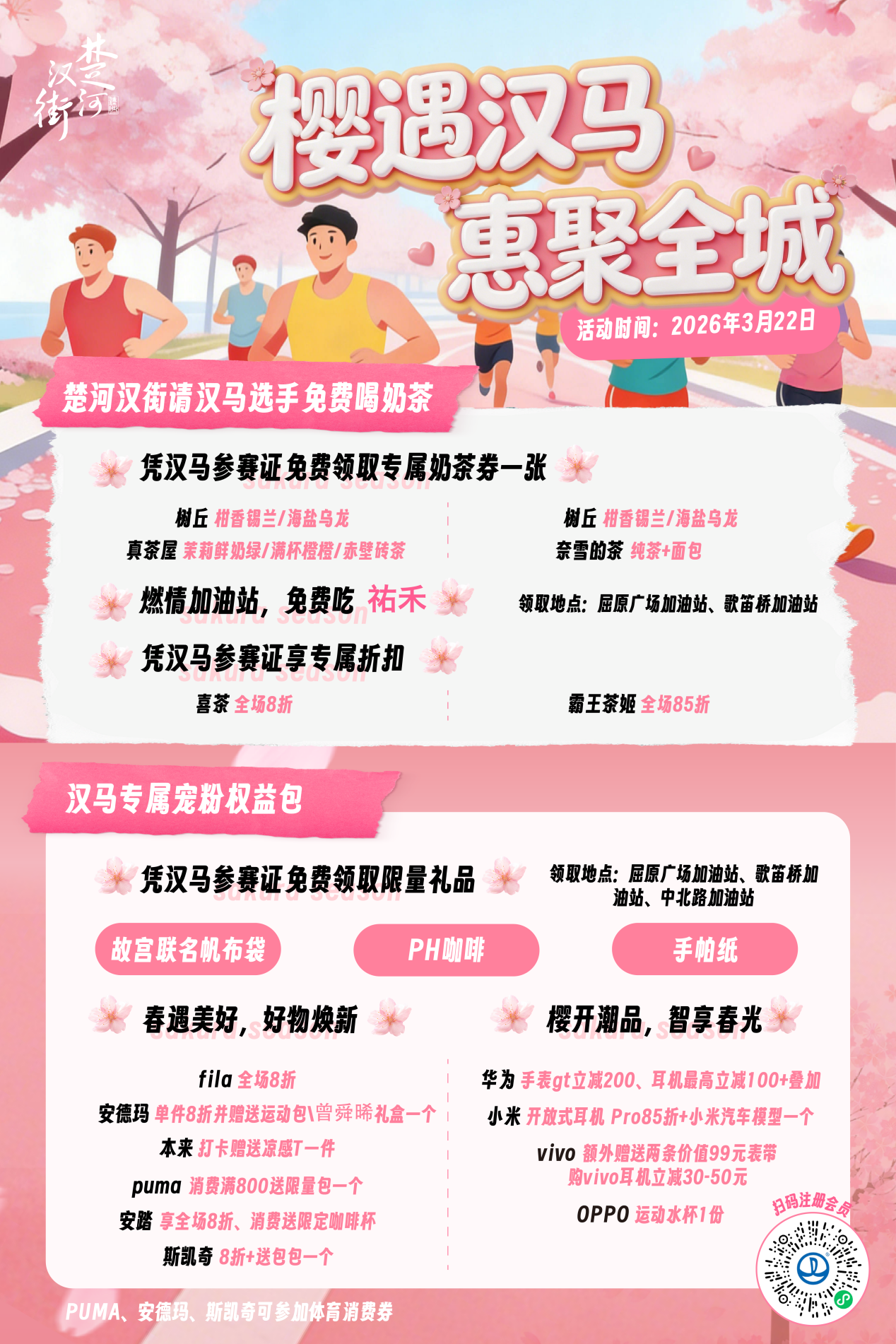 荆楚网(湖北日报网)讯(通讯员 蔡清艳)2026年武汉马拉松将于3月22日鸣枪开跑。作为赛道沿线的核心文旅商业地标,楚河汉街积极响应“汉马”热潮,将在赛事当天化身“最美赛道加油站”,设立三大官方应援点位,联动街区商户推出全城独有的选手专属权益,以体商文旅融合之势,向全球跑者展示“武汉城市客厅”的独特魅力。