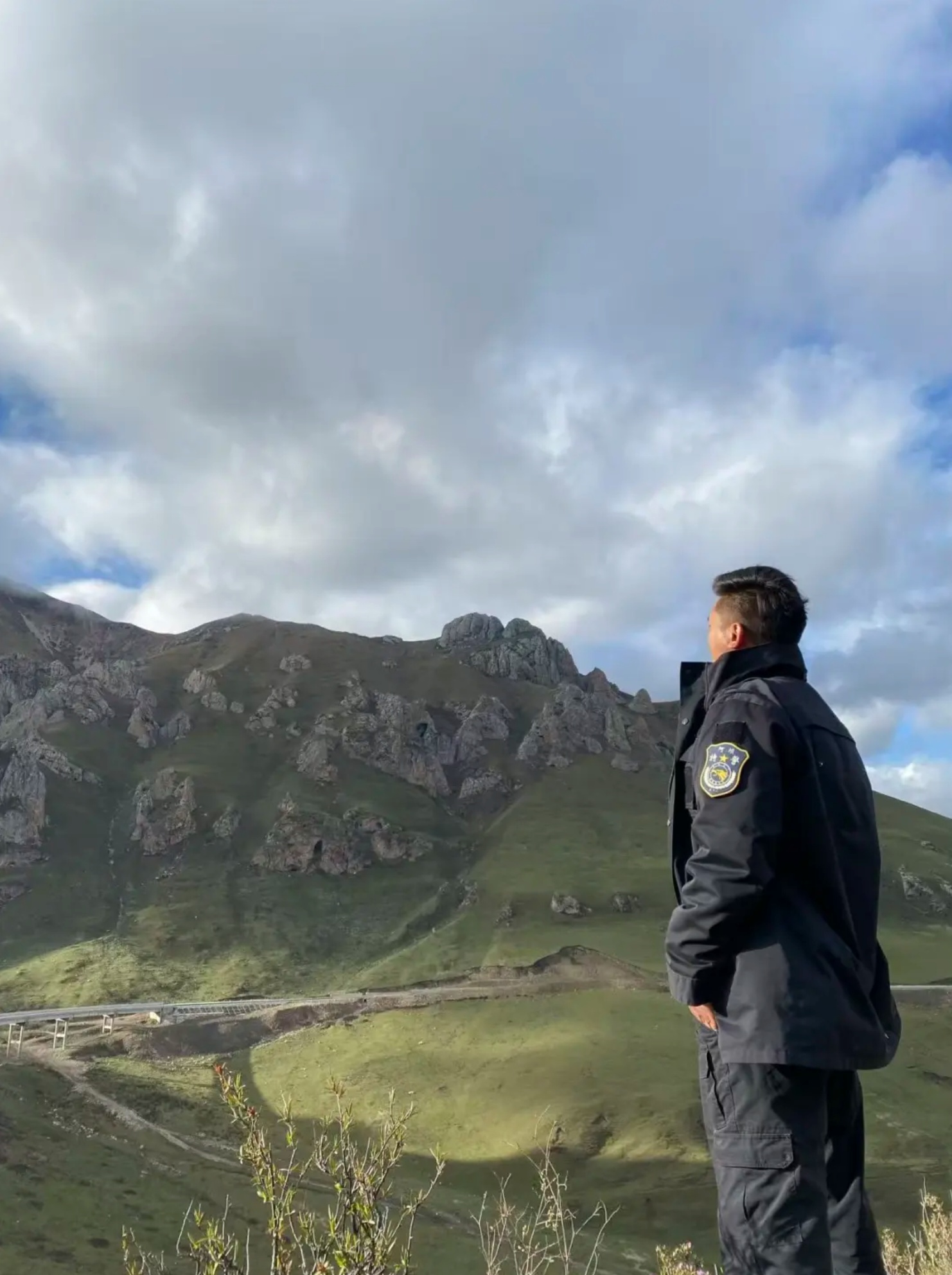 2021年5月,额旺格拉与麦溪派出所同事正在辖区巡山,同事拍下他远眺时的背影。图片来源:四川公安