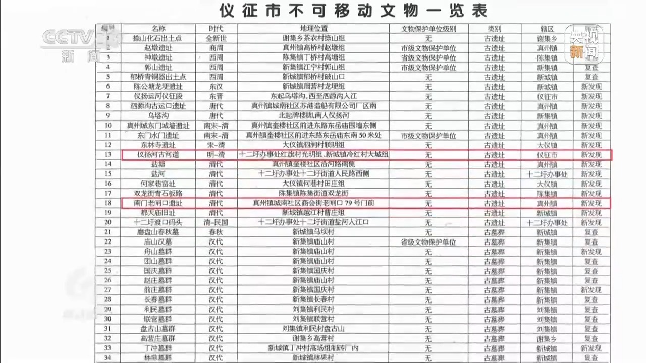 江苏仪征市文体广电和旅游局党委书记、局长 王武山:其中有一处2014年就灭失了,当时是一户居民自行改建,这次我们在第四次普查的时候,也依法上报进行迷失登记了。剩下的21处,7处是古井、河道、街道,另外14处叫文物建筑。14处建筑本身,3处属于文保建筑,11处是一般不可移动文物。