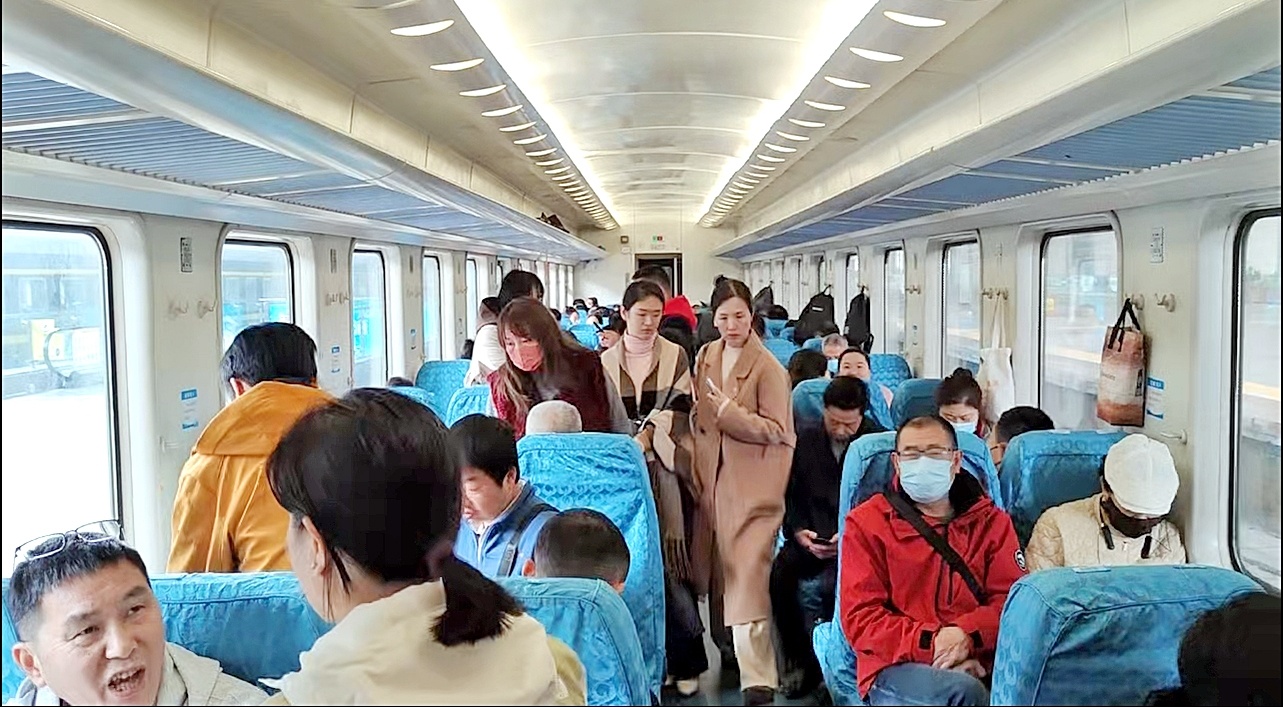 极目新闻记者登上列车看到,车厢内座无虚席,不少旅客只能站在过道上。