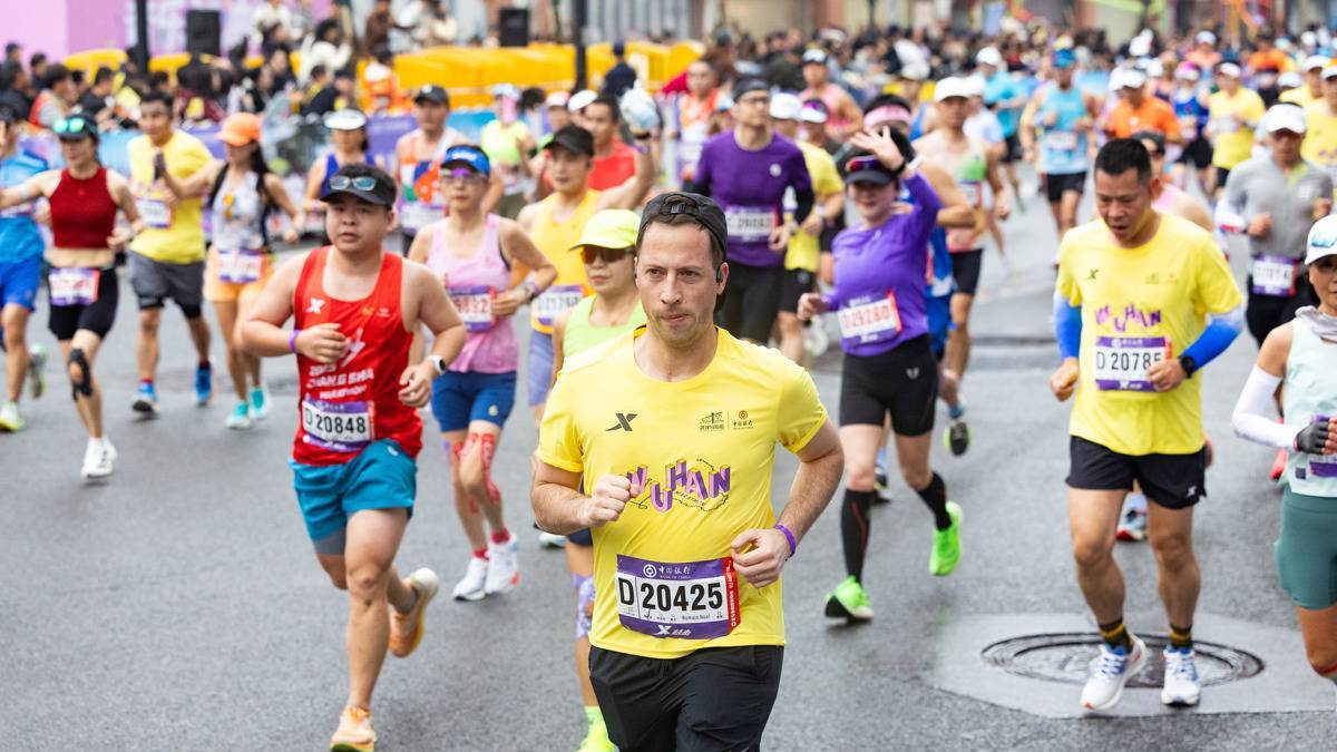 2026年3月22日,2026武汉马拉松鸣枪开跑,图为外国选手跑过武汉汉口百年中山大道上的汉口水塔。(湖北日报全媒记者 何宇欣 摄)