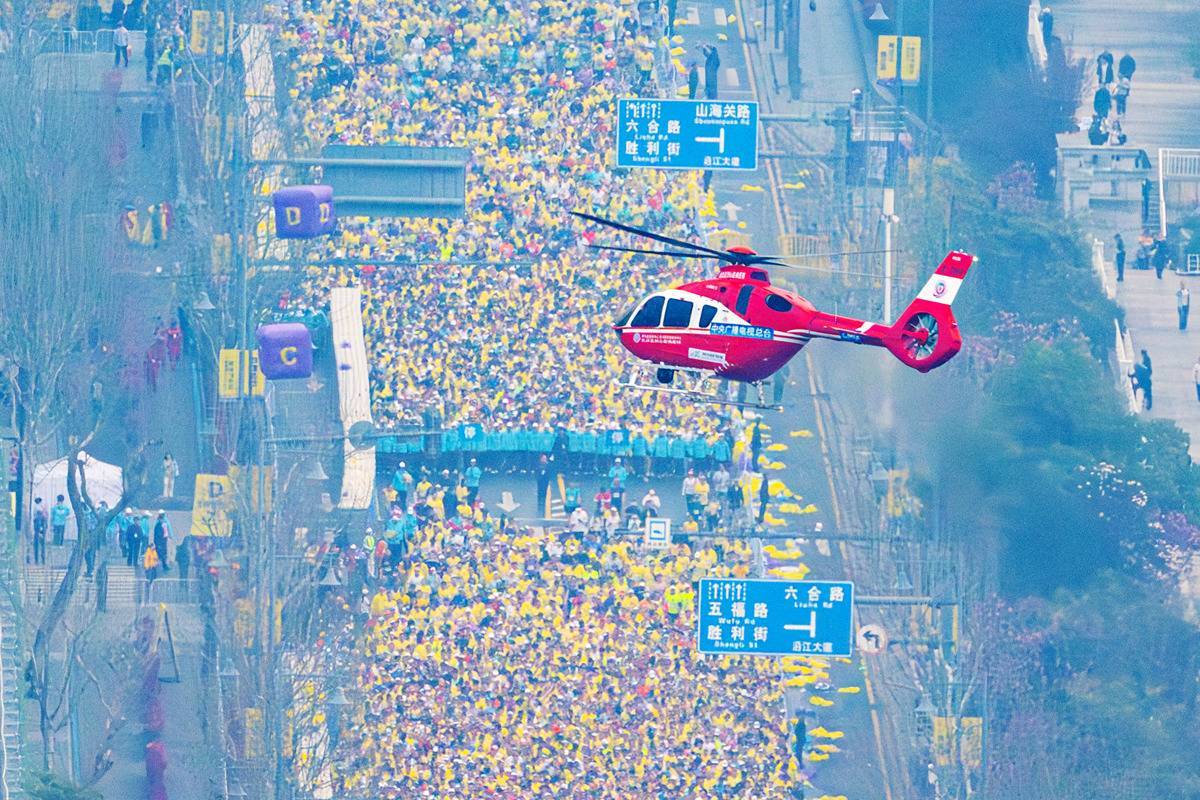 3月22日上午,直播直升机飞过汉马赛道上空。(湖北日报全媒记者 任勇 摄)