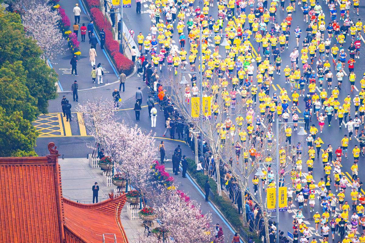 3月22日上午,汉马选手奔跑在沿江大道上,沿途樱花盛开。(湖北日报全媒记者 任勇 摄)