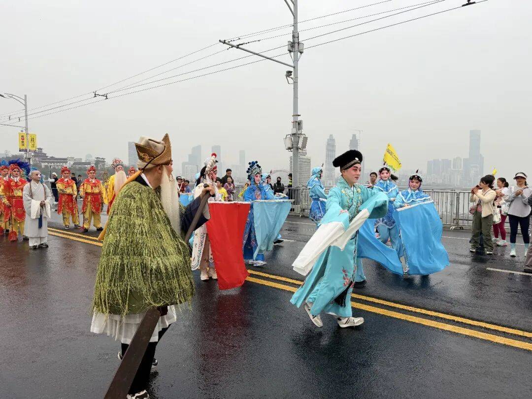 武汉戏码头经典戏曲人物巡游方阵率先登场,来自武汉京剧院、汉剧院、楚剧院的50名演员身着精美戏服、佩戴专业行头,以经典戏曲人物形象亮相长江大桥,尽显“戏水长流,戏聚江城”的深厚底蕴。
