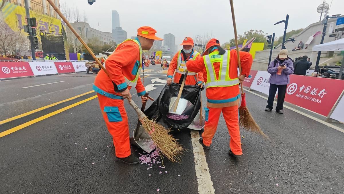 “各点位人员注意,选手已通过江岸赛段!”8:00刚过,随着对讲机指令响起,早已在赛道沿线各个点位待命的300余名环卫人员迅速出动,走上赛道,以最快速度投入清场作业,用分秒必争的行动守护城市颜值。