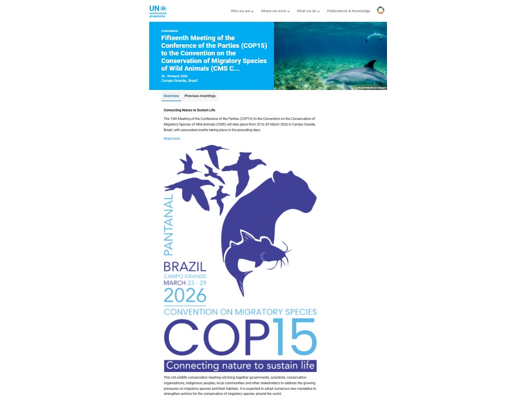 联合国《保护野生动物迁徙物种公约》(CMS)第十五次缔约方大会(COP15)将于3月23日至29日在巴西南马托格罗索州首府大坎普市召开。各国代表和观察员将齐聚一堂,共同商讨如何应对野生动物迁徙物种面临的紧迫生存挑战。