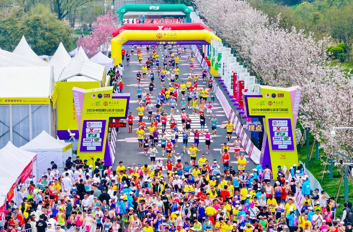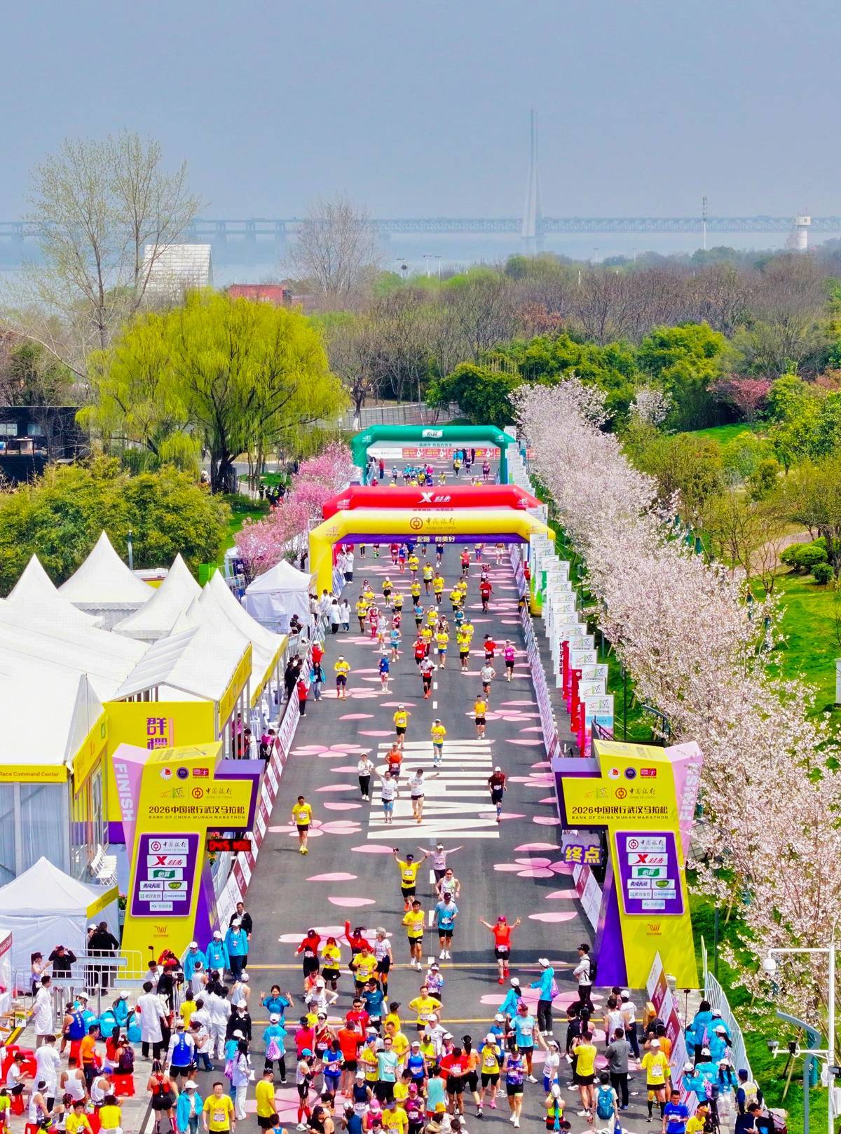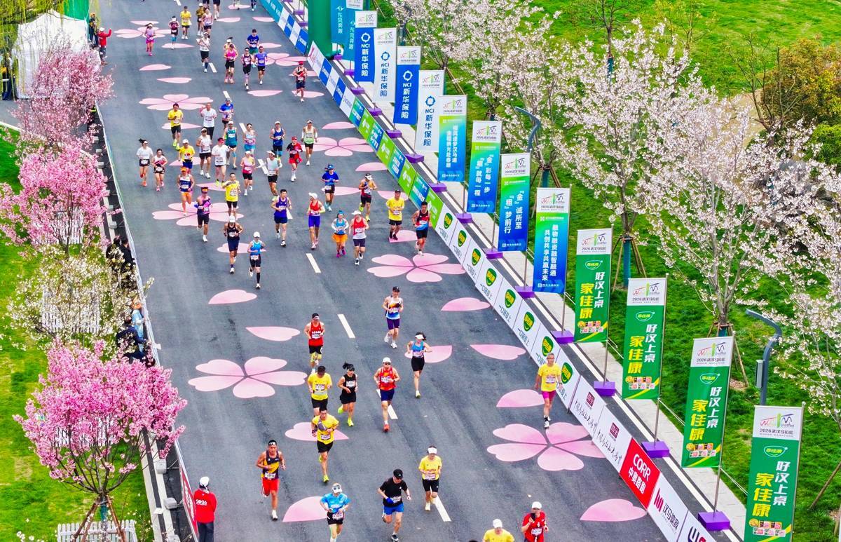 3月22日,参赛选手冲向终点。本届汉马终点区域被打造成“樱花大道”,营造出浓厚的浪漫氛围,成为赛道独具特色的景观。(湖北日报全媒记者 柯皓 通讯员 袁征 摄)