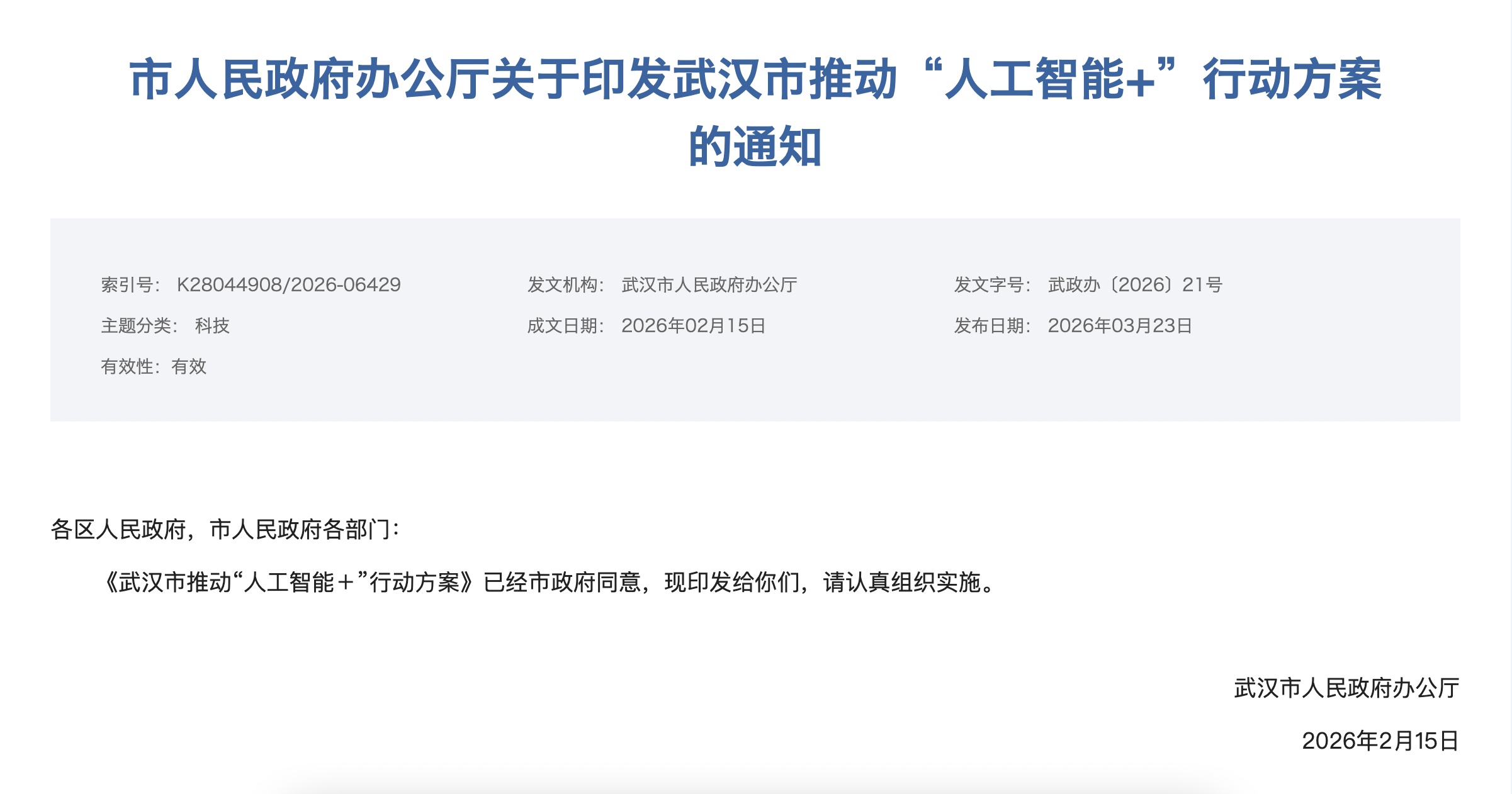 “智治赋能”工程包括两个方面。“人工智能+”社会治理方面,推进市政公共设施智能化改造升级,加强道路、桥隧的智能化监测维护,优化事件智能发现大模型及“城运人工智能助手”,增强事件感知、预警、处置能力,提升“一网统管”智能化水平,加快人工智能在公共资源招投标中的应用,推动公共数据合规共享,建设国土空间规划实施监测网络,深化智能终端在交通指挥、固定线路巡逻、排爆、危化品处置、防火巡查、应急救援等场景应用,推动人工智能赋能网络空间治理,支持东湖高新区低空共享无人机应用示范区建设,支持江岸区、江汉区分别探索建设人工智能赋能智慧交通、智慧物业新模式,到2028年底打造30个社会治理智能体。