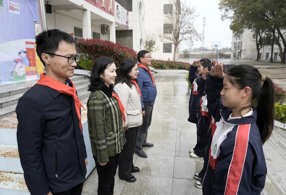 学生代表从赠书嘉宾手中接过崭新的图书,并亲手为赠书嘉宾佩戴上红领巾,用质朴而真挚的方式表达感激之情。