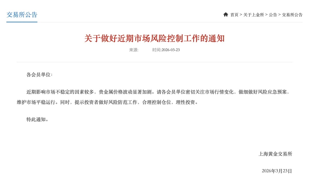 上海黄金交易所23日发布通知:近期影响市场不稳定的因素较多,贵金属价格波动显著加剧。请各会员单位密切关注市场行情变化,做细做好风险应急预案,维护市场平稳运行。同时,提示投资者做好风险防范工作,合理控制仓位,理性投资。