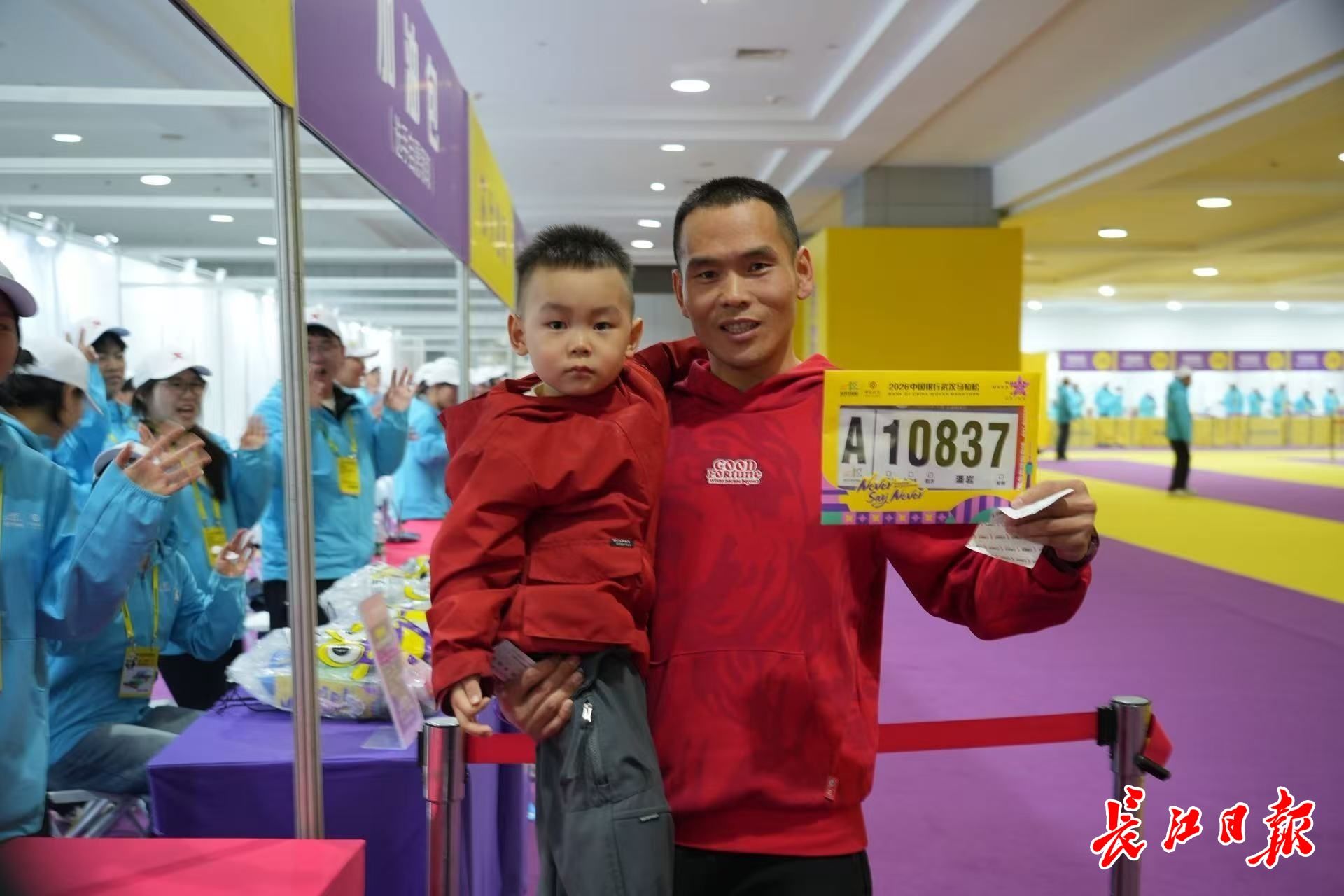 潘岩带儿子领取参赛包。记者耿珊珊 摄