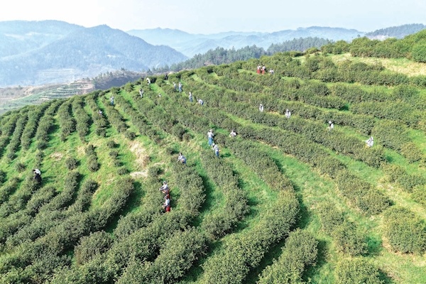 郧阳区青山镇周家河村的有机茶园内,茶农采茶忙。