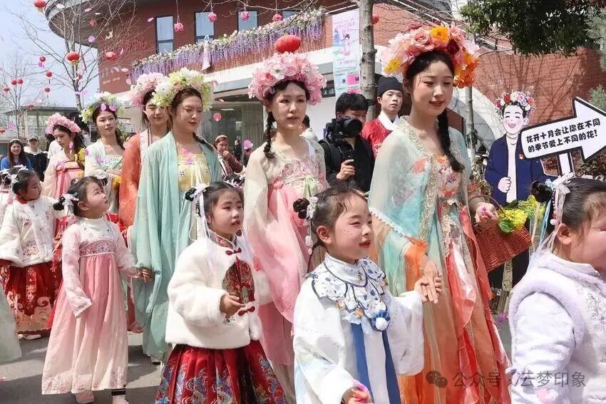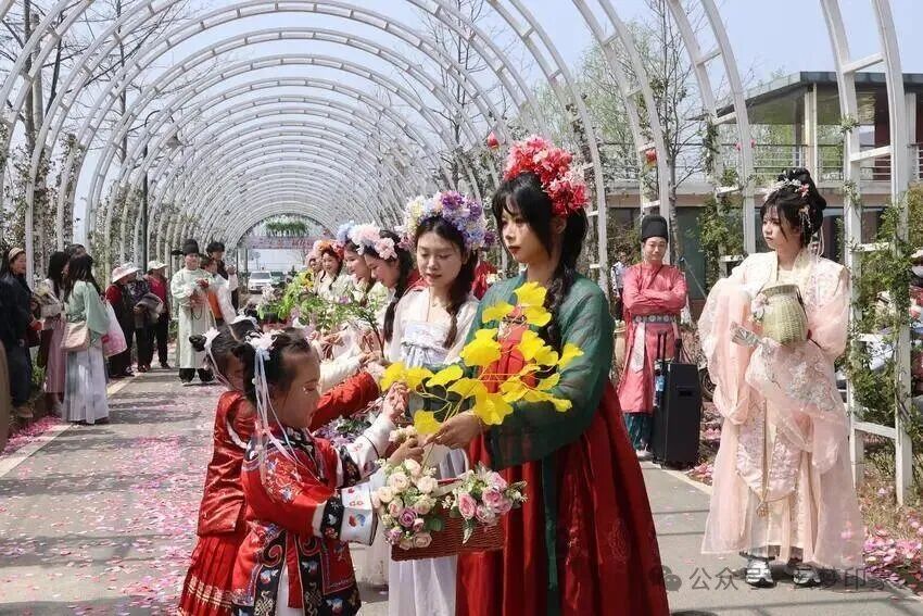当日暖阳和煦,清风拂过千亩油菜花田,翻涌成金色浪涛,为盛会铺就绚烂底色。上午九时许,万众期待的花神巡游惊艳登场。十二位身着锦绣华服的“花神”手执名花,步履轻盈从园区入口款款而行,衣袂翩跹、簪花照影,眉眼流转间尽显东方雅致,宛若画中仙子降临人间。沿途游客纷纷举机定格美景,汉服爱好者主动汇入巡游队伍,与“花神”互动同游,瞬间穿越千年,再现古人踏春赏红的热闹盛景,快门声、赞叹声此起彼伏。