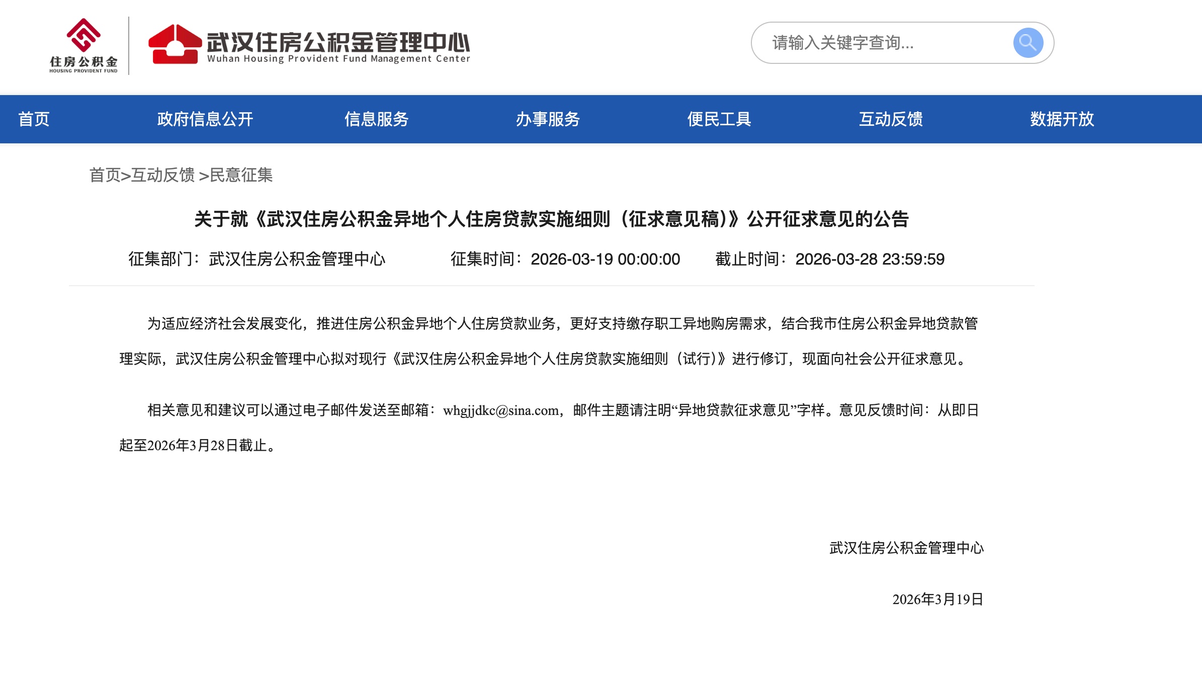 湖北日报讯(记者杨文漪、通讯员吴冬晖)武汉住房公积金管理中心近日发布公告,就《武汉住房公积金异地个人住房贷款实施细则(征求意见稿)》公开征求意见,时间截至3月28日。此次修订在原试行细则基础上进行了多项优化,涉及贷款条件、套数认定、证明材料、办理流程及业务范围等方面。