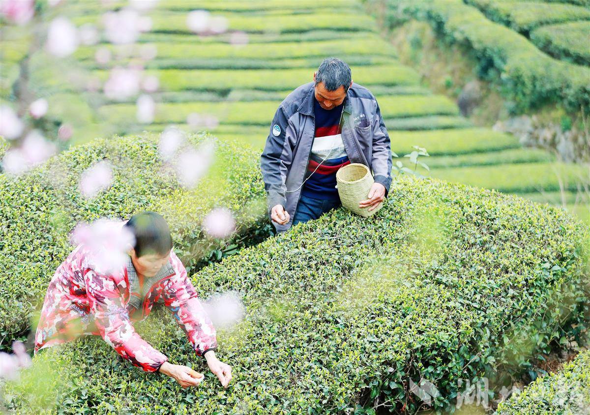宜昌市秭归县,春暖花开,新茶吐绿,茶农忙着采茶,抢鲜供应市场。(视界网 王罡 摄)