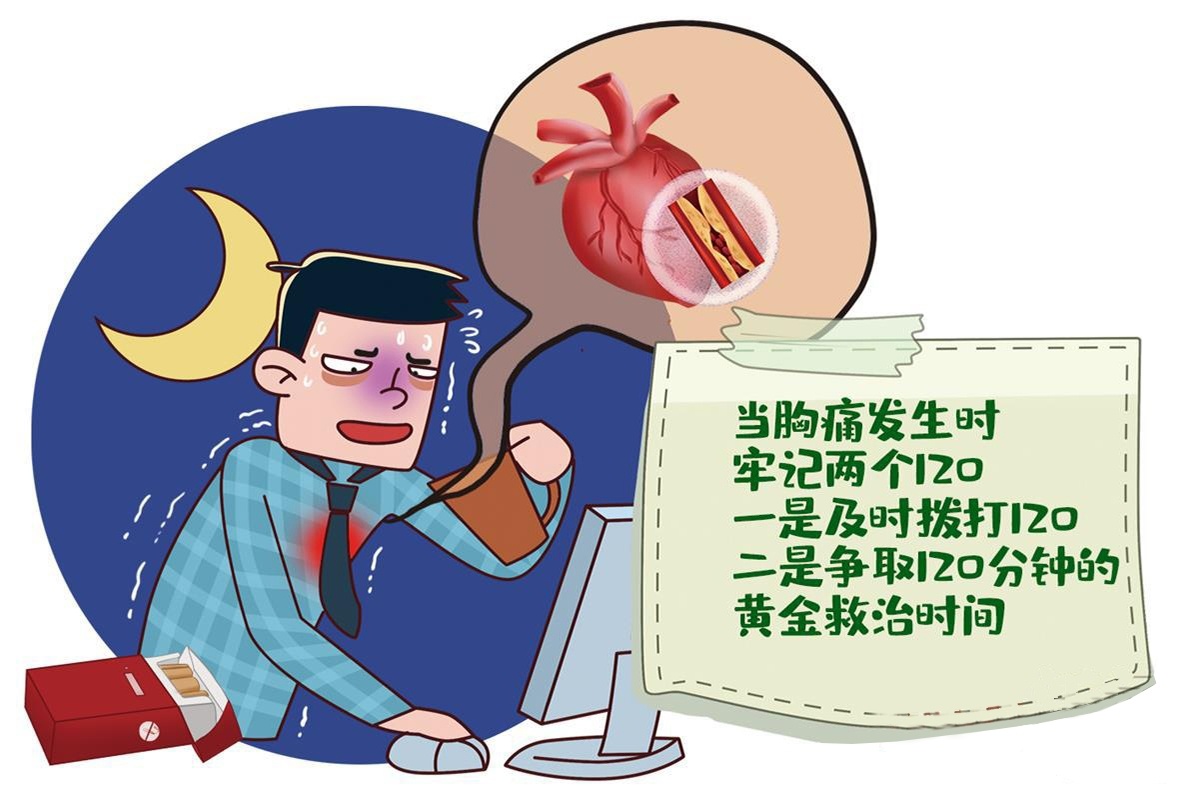 但要注意,胸痛发生时,要牢记两个120:一是“有胸痛,及时拨打120”,千万不要自己开车去医院,路上一旦发生突发状况将危及生命;二是“心梗救治,争取黄金120分钟”,急性心肌梗死抢救的黄金时间为120分钟,从发病到开通梗死血管如能在120分钟内完成可大大降低病死率和致残率。