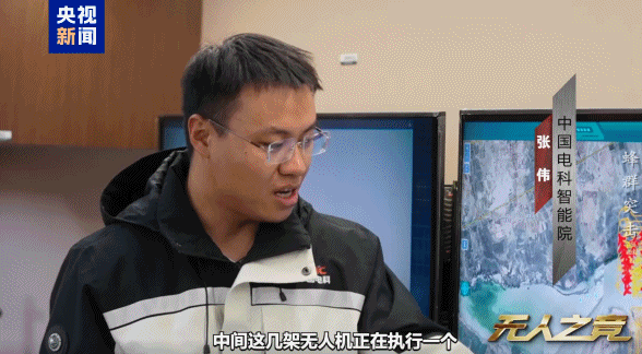 中国电科智能院 张伟:上方这些无人机正在执行区域封控的任务,中间这几架无人机正在执行区域搜索及圆环跟踪任务,下面圆环集结的无人机是无人机蜂群的后备队。当无人机被摧毁或者要进行任务调整时,这些无人机可以前往进行实时补位。