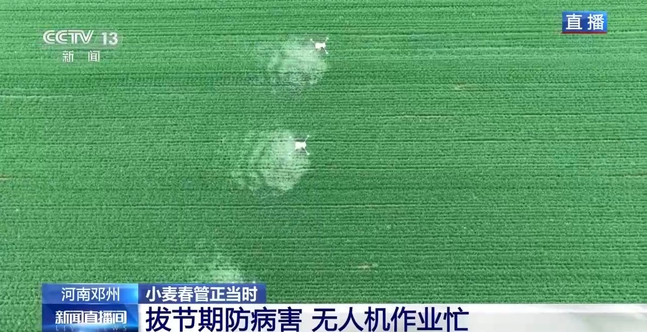 春争日夏争时,未来五天,河南的白天最高气温都在20℃以上,小麦生长由返青起身期进入到拔节期,拔节期的小麦长势快,也是需要大量水肥的关键期。此前河南有大范围降雨,目前小麦土壤墒情都很好,不需要浇水。农田里正在进行无人机飞防作业,主要是防治病虫害。病主要防治小麦条锈病、赤霉病,虫害主要是防蚜虫和红蜘蛛。
