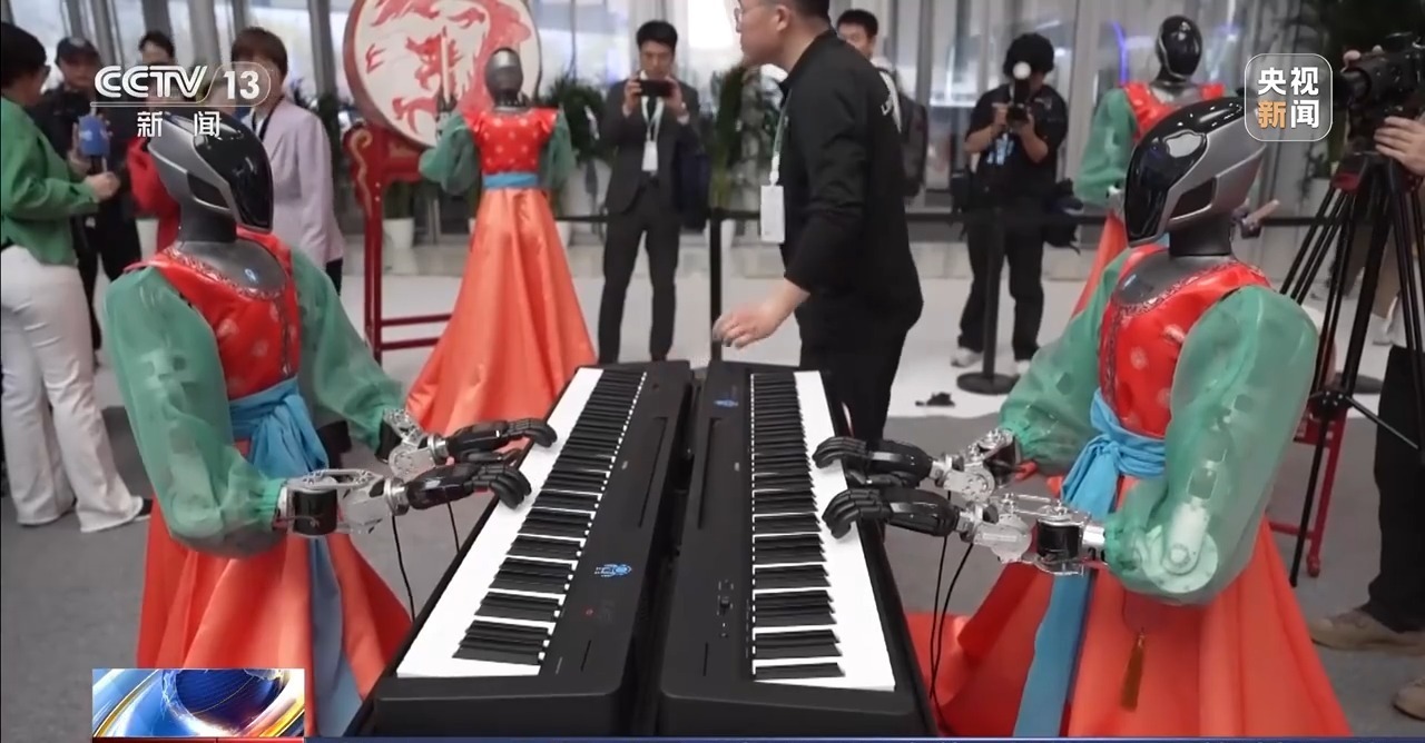 总台记者 夏子雅:“组团”亮相的不只提供美食的“师傅们”,还有一群多才多艺的机器人乐手们。有弹钢琴、电子琴的,有击鼓的,乐器各不相同,但“演奏之手”同样协调与灵活。