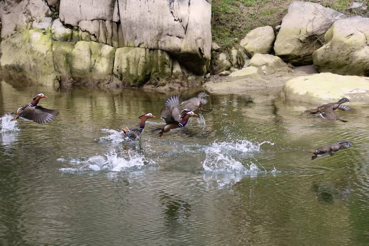 鸳鸯是国家二级保护野生动物,对栖息地同样敏感。鸳鸯生性机警,善游泳、潜水和飞行,春冬季主要以青草、树叶、植物果实等为食,繁殖季则偏爱昆虫、小型鱼类等动物性食物,常成群活动。此次在南河段发现的鸳鸯群体,数量可观、状态良好,印证南河已成为它们理想的栖息觅食场所。
