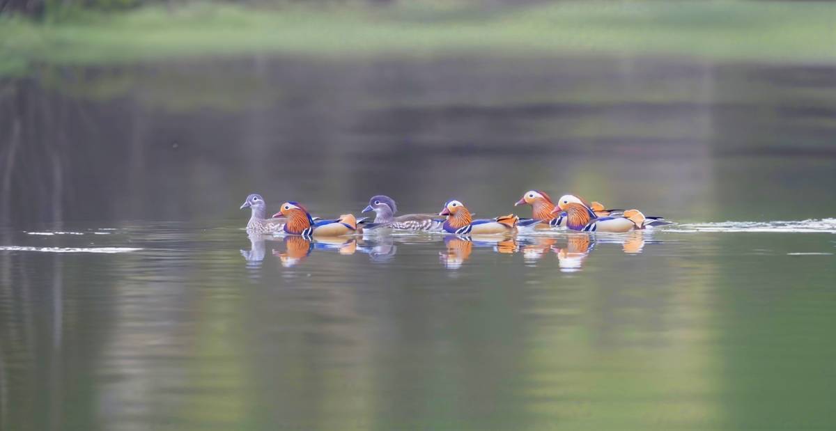 襄阳市保康县南河流域,国家二级保护野生动物鸳鸯组团“春游”,绚丽羽毛与水面相映成趣。(荆山观鸟队供图)