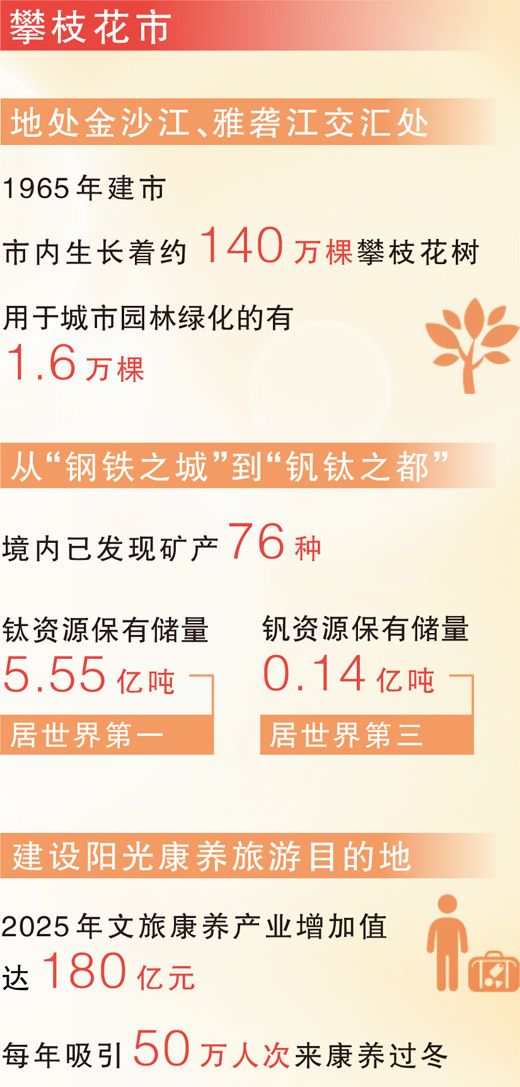 “火红的攀枝花,陪伴着我们探索资源型城市的转型发展之路。”攀枝花市文化广播电视和旅游局产业科科长马文超说,通过做好“康养+”融合文章,推广“暖暖花城·慢慢生活”等文旅品牌,康养产业建圈强链取得良好成效。攀枝花连续6年跻身中国康养可持续发展20强市,每年吸引50万人次来康养过冬,2025年文旅康养产业增加值达180亿元。