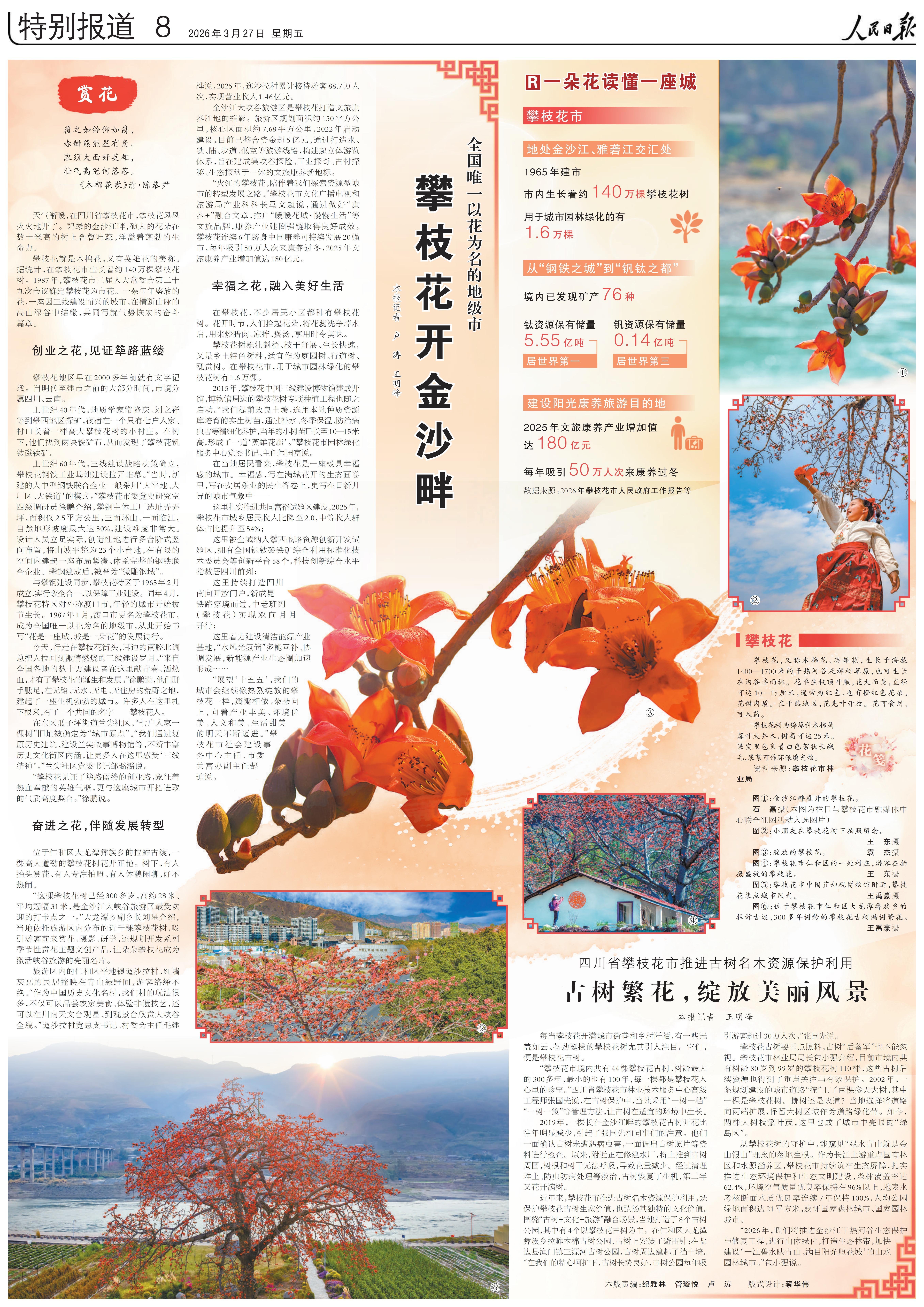 “这棵攀枝花树已经300多岁,高约28米、平均冠幅31米,是金沙江大峡谷旅游区最受欢迎的打卡点之一。”大龙潭乡副乡长刘星介绍,当地依托旅游区内分布的近千棵攀枝花树,吸引游客前来赏花、摄影、研学,还规划开发系列季节性赏花主题文创产品,让朵朵攀枝花成为激活峡谷旅游的亮丽名片。