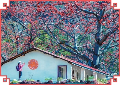 攀枝花市仁和区的一处村庄,游客在拍摄盛放的攀枝花。王 东摄
