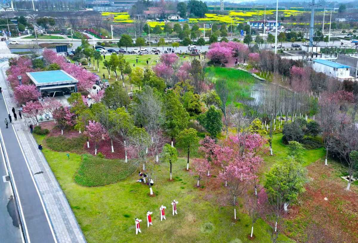 地铁11号线未来三路站街边公园满树繁花(通讯员产启斗摄)