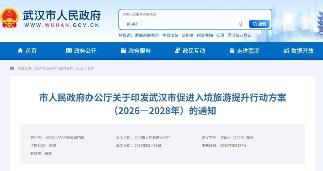 湖北日报讯(记者冯袁玥)3月27日,武汉市人民政府网发布《武汉市促进入境旅游提升行动方案(2026—2028年)的通知》。