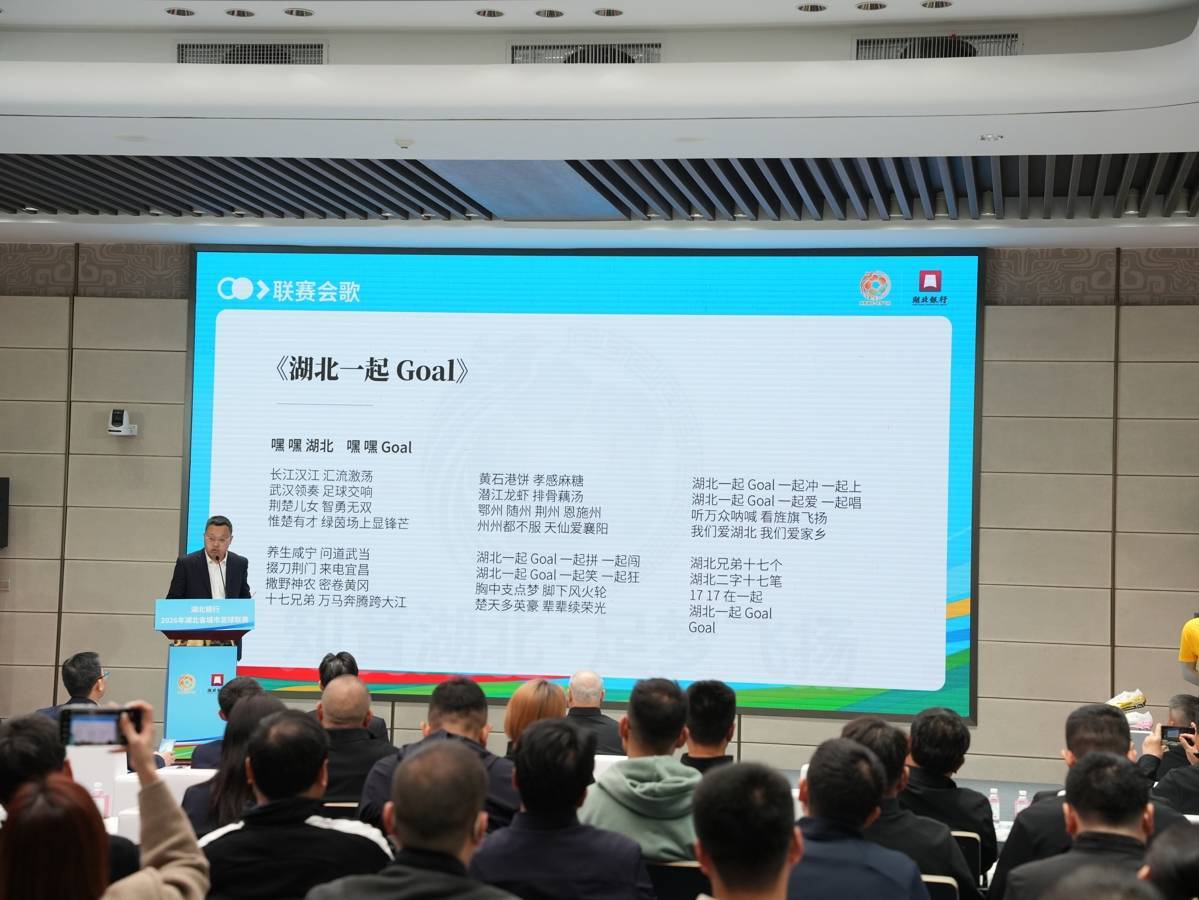 3月26日上午,武汉中国车谷国际体育文化交流中心。湖北省城市足球联赛官宣仪式现场,这首熟悉的旋律再次响起。与联赛logo、吉祥物、奖杯一同揭晓的,还有两首会歌——《足梦湖北》和《湖北17Goal》。