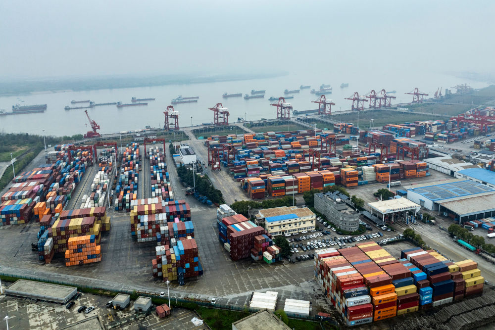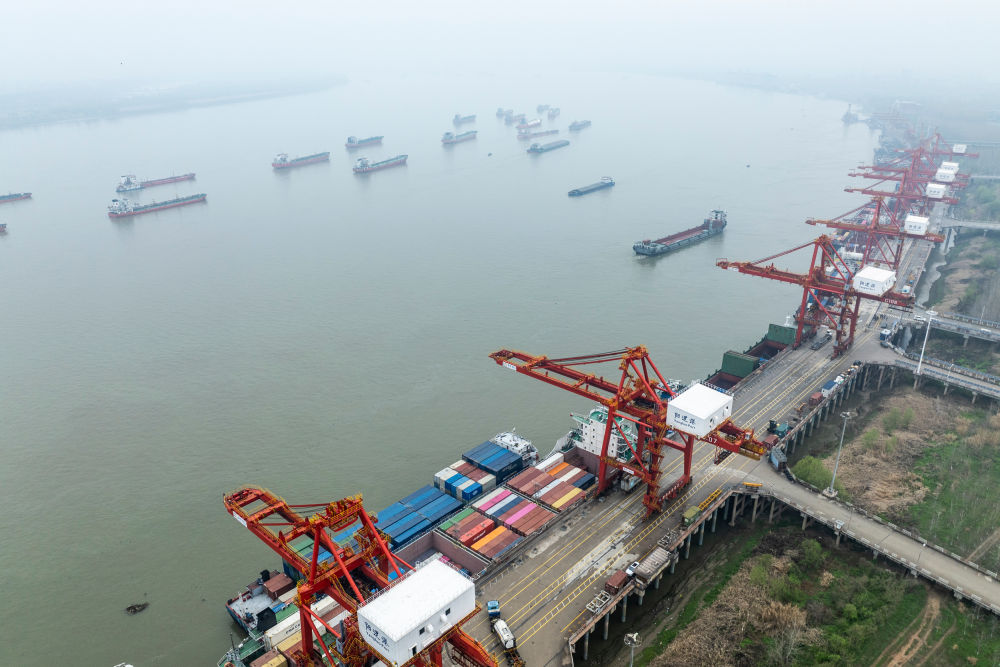 ↑ 3月26日拍摄的武汉阳逻港(无人机照片)。