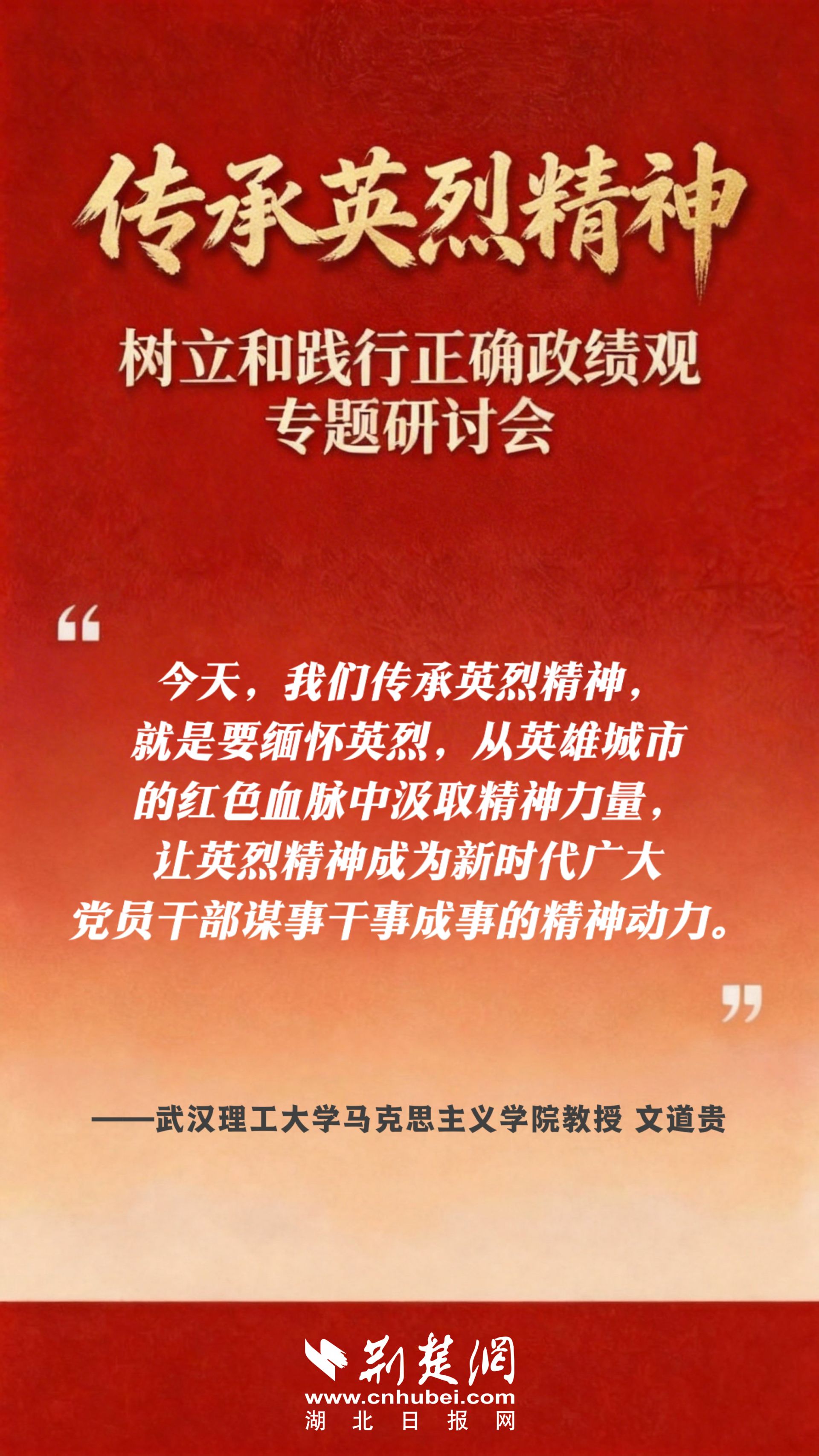 荆楚网(湖北日报网)讯(记者 白云 通讯员 王璐、朱姝颐)赓续英雄城市红色血脉,以英烈精神之光照亮新时代干部“政绩观”。3月27日,武汉市退役军人事务局组织召开“传承英烈精神,树立和践行正确政绩观”专题研讨会。研讨会上,武汉理工大学马克思主义学院教授文道贵提出,传承英烈精神,前提是准确把握武汉红色历史脉络,重点是深刻领会革命英烈的感人事迹,目的是赓续红色血脉。