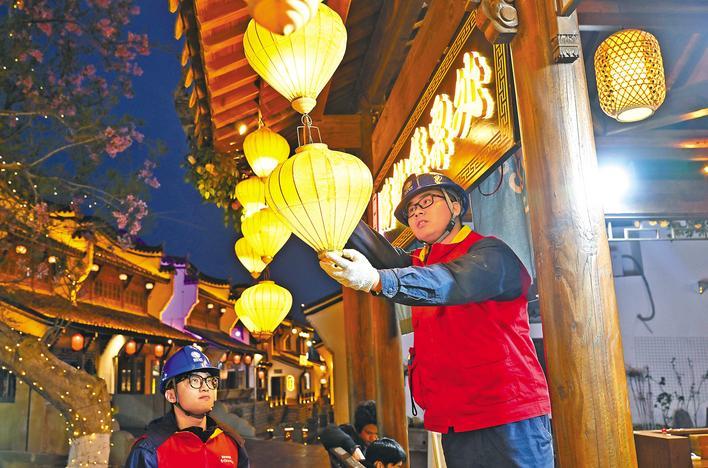 3月25日晚,国网云梦县供电公司吴铺供电所运维人员对祥云湾景区照明设施开展专项巡检,排查消除安全隐患,全力保障景区夜间用电安全稳定,为游客营造舒心游览环境。祥云湾景区集古建观光、文化体验、夜间经济于一体,是当地重点文旅项目。(湖北日报全媒记者 陈迹 通讯员 余健兵 摄)