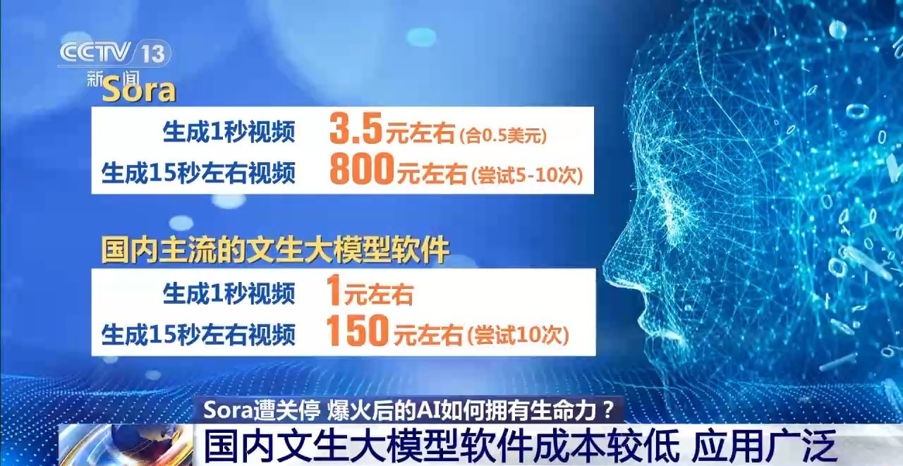 而我们从用户的使用成本来计算可以发现,Sora每生成一秒视频,用户需要支付0.5美元,折合人民币约3.5元;生成一段15秒左右的理想镜头则需要尝试5~10次,合人民币约800元。而使用国内主流的文生大模型软件每生成一秒的视频,成本只需要1元左右,即使是尝试生成10次15秒左右的镜头,也只需要150元左右的成本,成本只有Sora的五分之一不到。