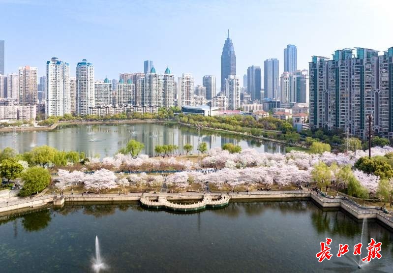 龟山樱花栈道游人摩肩接踵,樱花簇拥的知音殿与汉口、武昌高楼隔江相望。长江日报记者苗剑 摄