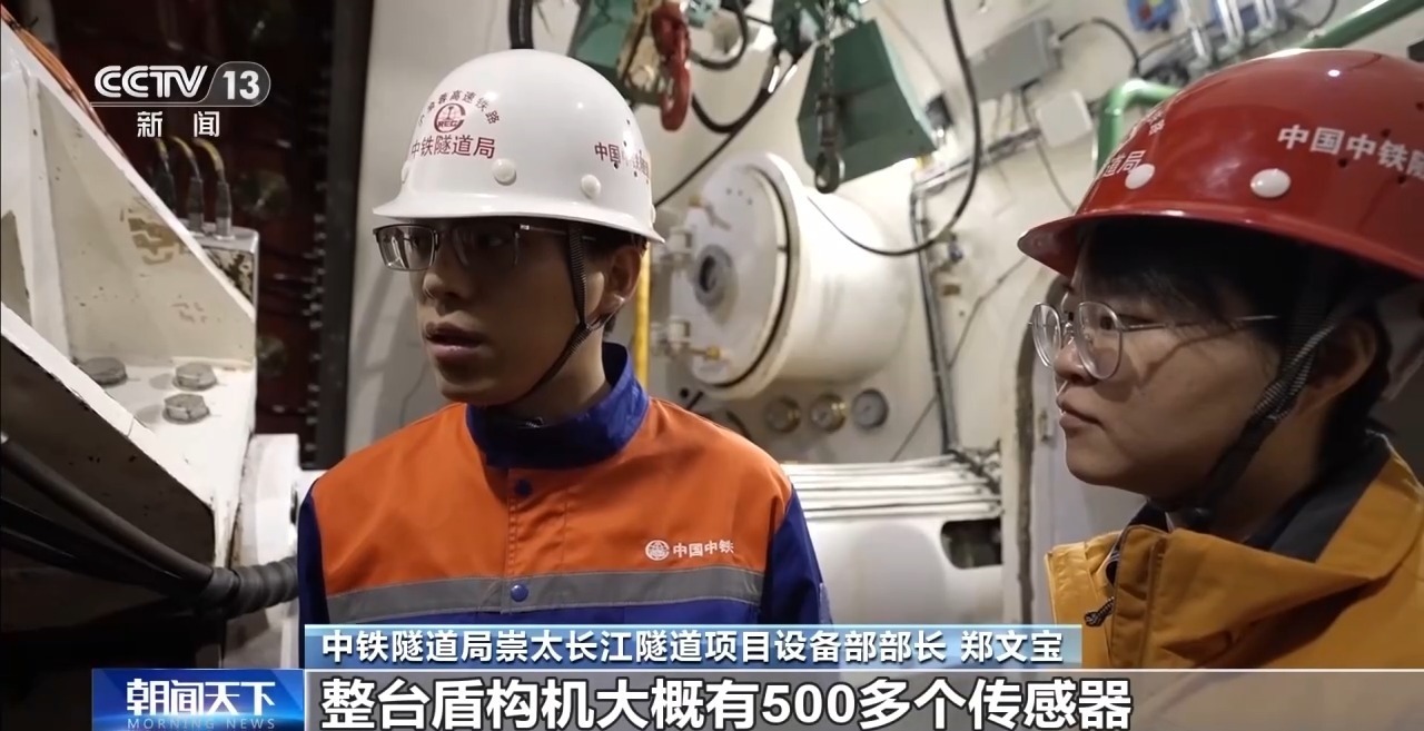 中铁隧道局崇太长江隧道项目设备部部长 郑文宝:有一个压力传感器,刀具的后面有个刀具磨损传感器,还有管路上的流量计,整台盾构机大概有500多个传感器。