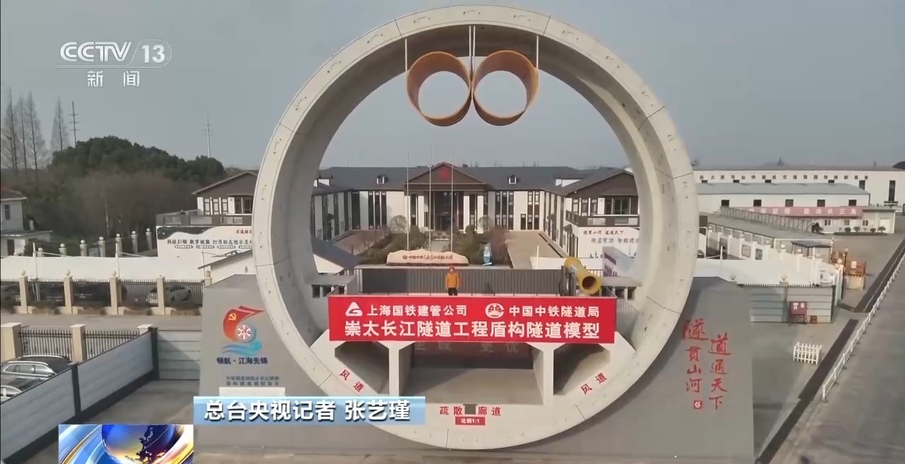 总台央视记者 张艺瑾:我身旁的这个大圆环是一个1∶1还原的隧道模型,它由10块巨大的管片拼装而成,修建整条崇太长江隧道需要将近7000个这样的大圆环,构筑起高强度的隧道内壁。