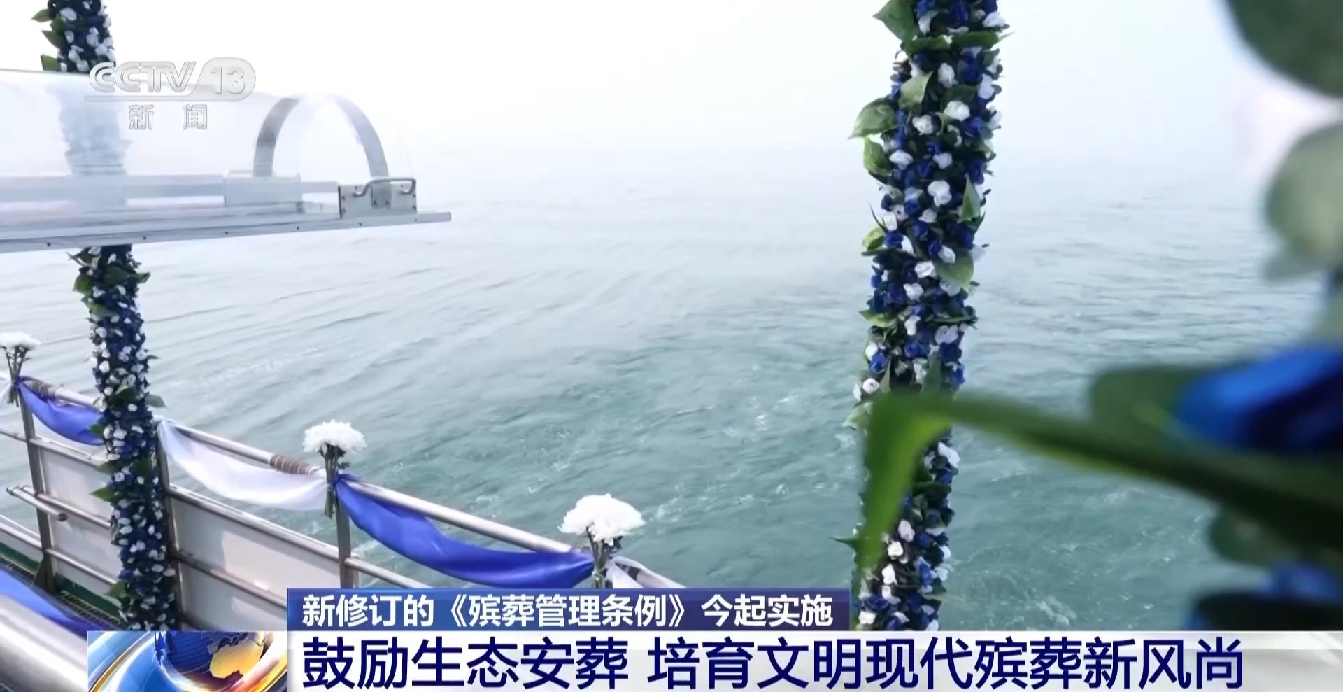 新修订的《殡葬管理条例》明确,在实行火葬的地区,鼓励和引导骨灰海葬、树葬、花葬、草坪葬等安葬方式,有条件的地方可以给予适当补贴。这是天津市举行的一场海葬活动,船行至指定海域,海上追思仪式正式开始,家属们将手中的鲜花花瓣轻轻撒向大海,追忆逝去的亲人。