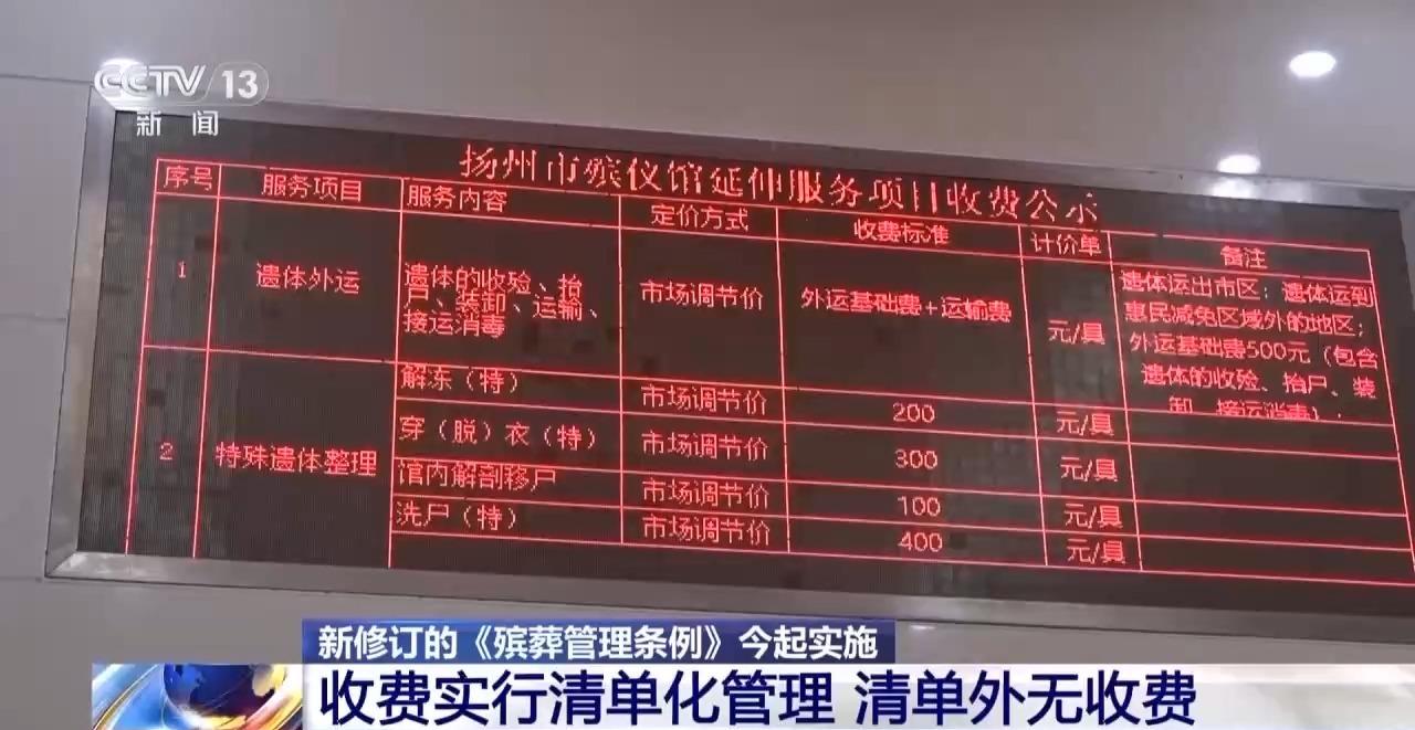 根据新修订的《殡葬管理条例》,殡葬服务收费都实行像这样的清单化管理,国家制定基础项目清单及收费标准,非基础项目的收费价格同样依法实行严格管理,禁止在清单之外设立项目、收取费用。国家逐步将具备条件的殡葬服务项目纳入国家基本公共服务范围并动态调整,保障全体公民能够公平可及地享有殡葬基本公共服务。