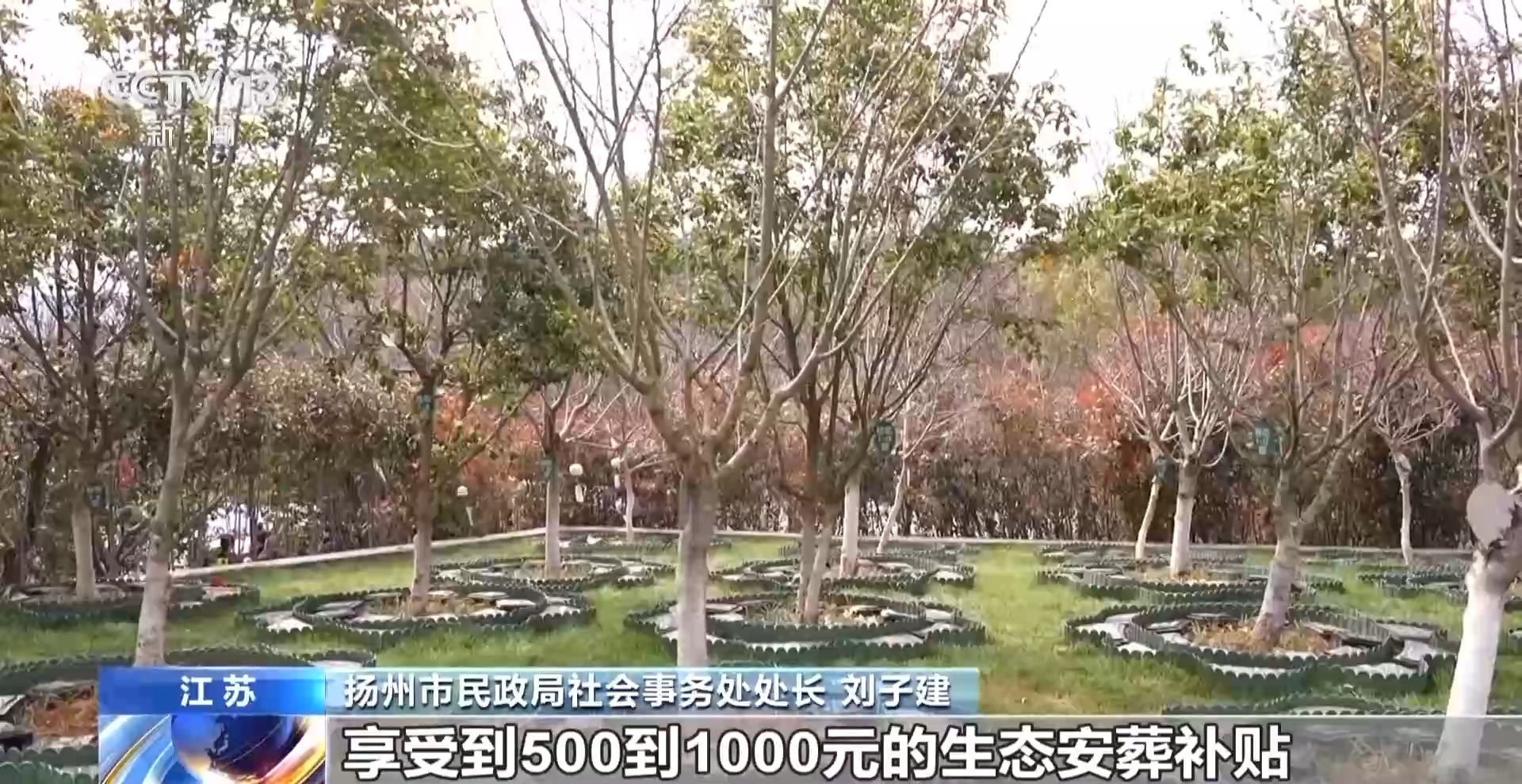 江苏省扬州市民政局社会事务处处长 刘子建:生态葬本身是免费的,同时根据户籍,每户居民还可以享受500—1000元的生态安葬补贴。