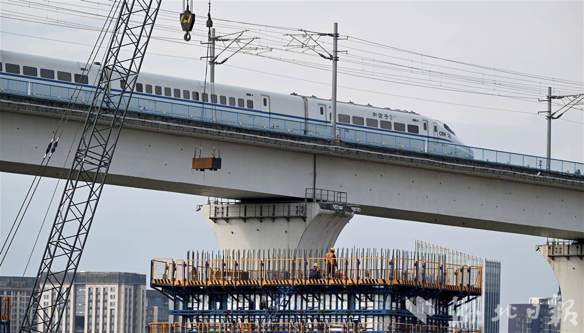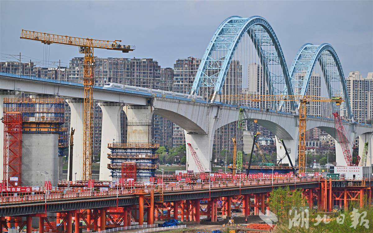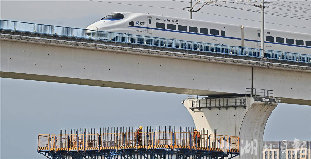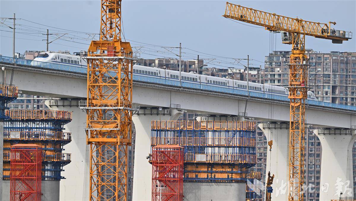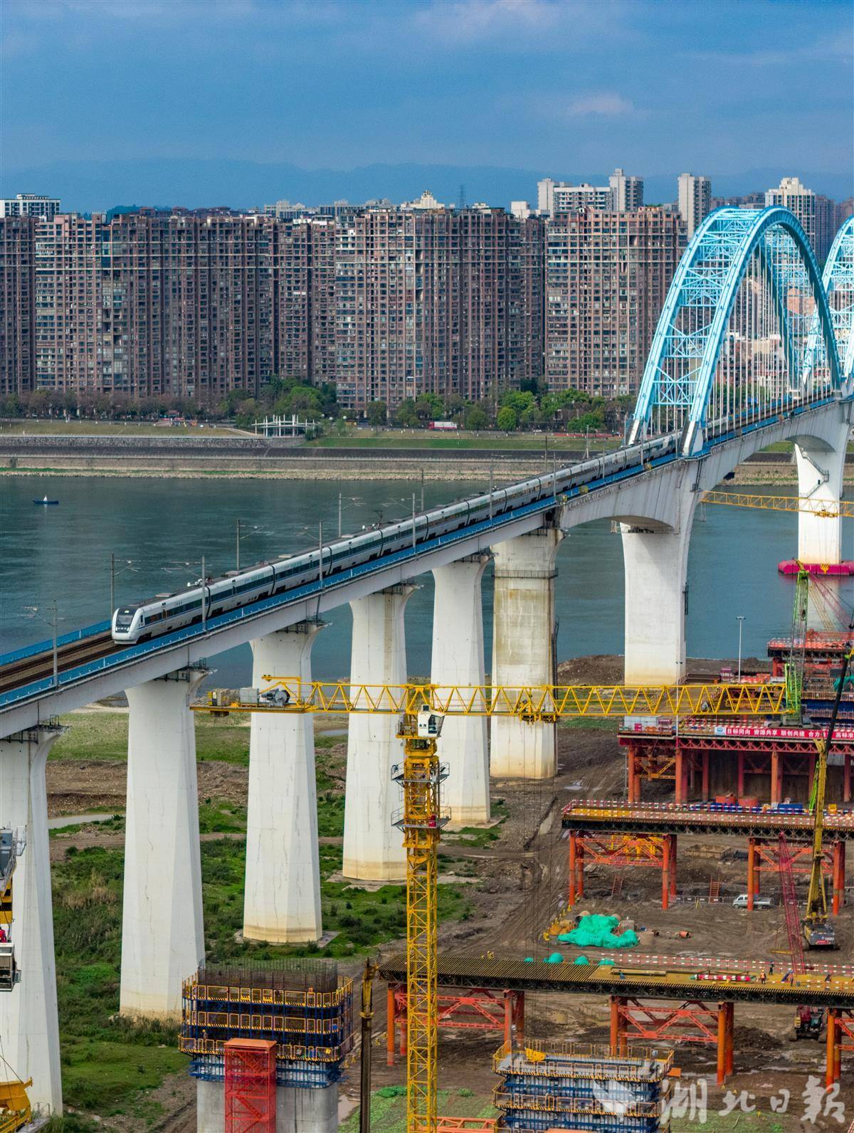 沪渝蓉沿江高铁宜昌长江公铁大桥正式进入主塔施工攻坚期。紧邻的宜万铁路老桥上,动车驰骋、往来不息;新建大桥施工现场,机器轰鸣、一派繁忙,新旧两桥并行相映。(湖北日报全媒记者 刘曙松 摄)