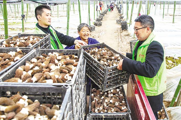 3月24日,襄城区卧龙镇新建村羊肚菌种植基地,中国邮政工作人员正在帮种植户采摘分拣羊肚菌。 (湖北日报通讯员 李旭晖 摄)